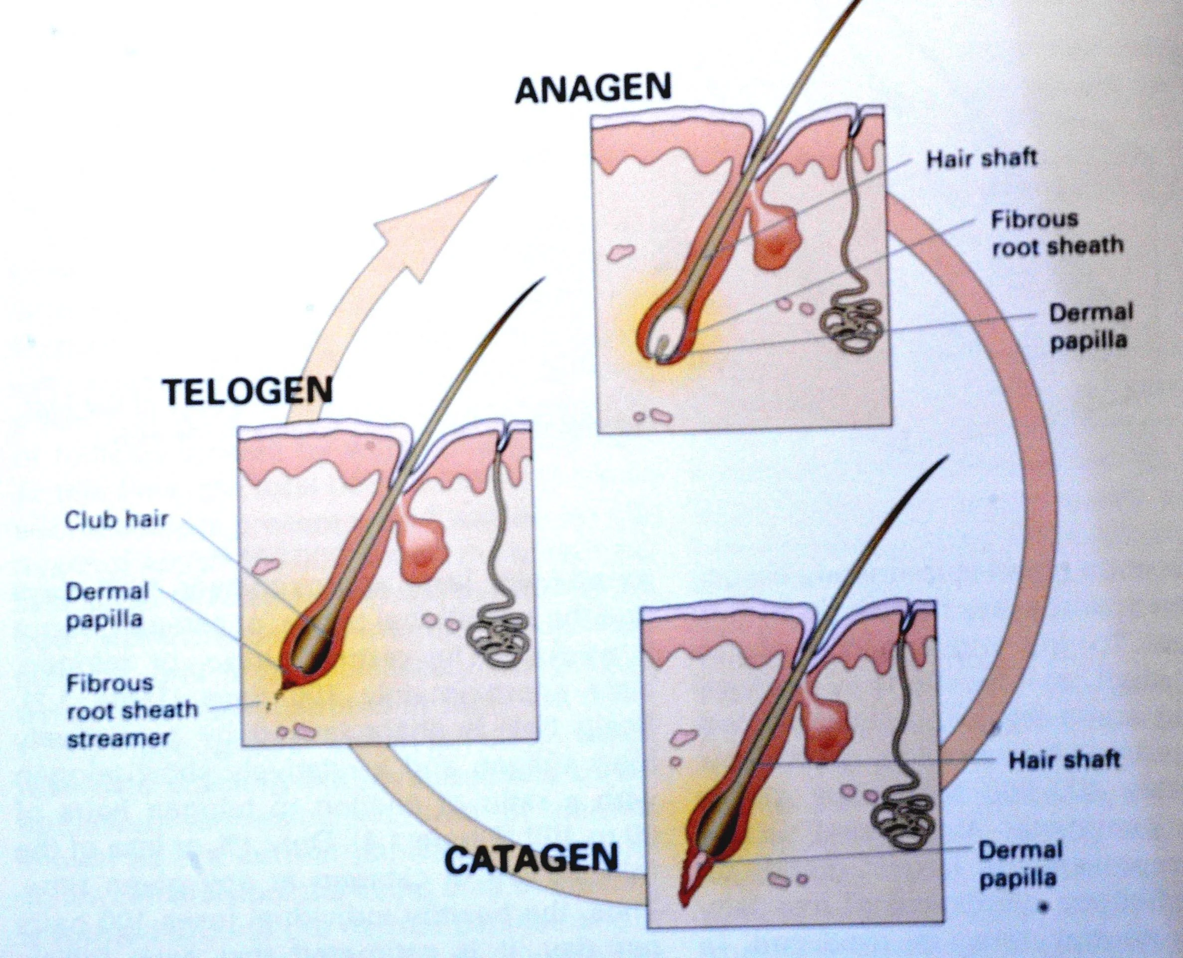 It is believed that each hair follicle goes through 10-20 hair cycle in a life time. There are four phases-