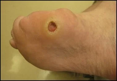 Chronic ulcer on the foot of a patient with peripheral neuropathy related to diabetes.