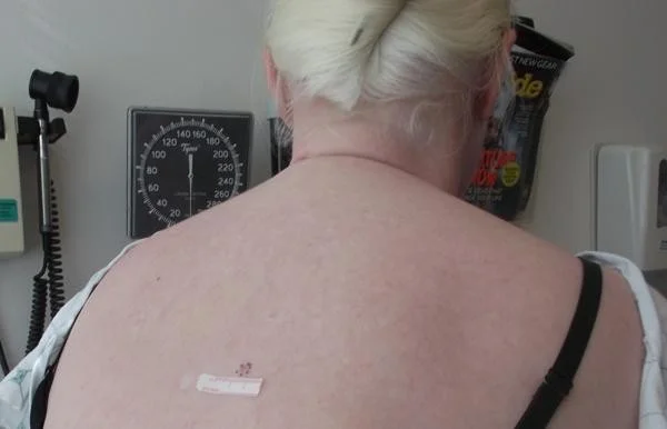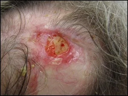 This patient has a chronic ulcer following trauma on the scalp in a site previously irradiated as part of treatment for squamous cell carcinoma.