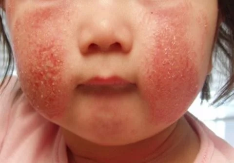 bilateral erythematous scaly plaque in cheeks of female child - ill demarcated - Atopic Dermatitis