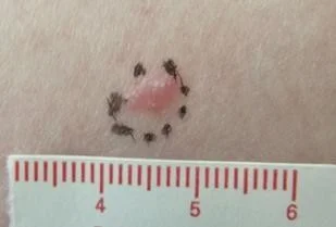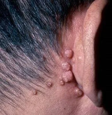 Multiple variable sized Pappules/nodules, located right post auricular, Male