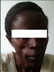 - This patient has HIV-associated lipoatrophy, characterized by loss of fat throughout the face.
