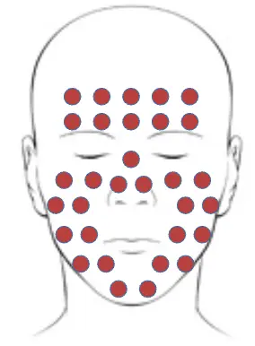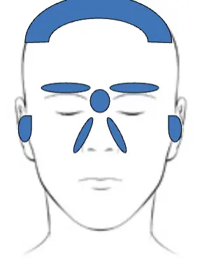- Eyebrows, nasal creases, external auditory canals