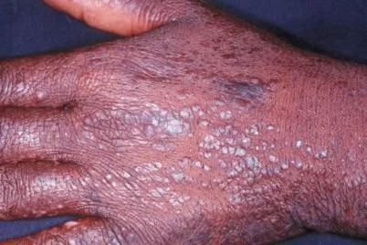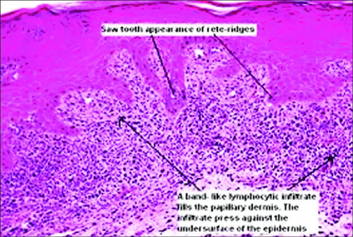 Histology→ hyperkeratosis, focal hypergranulosis, thickening of the epidermis (saw toothed appearance) Z ,separation between dermis and epidermis.