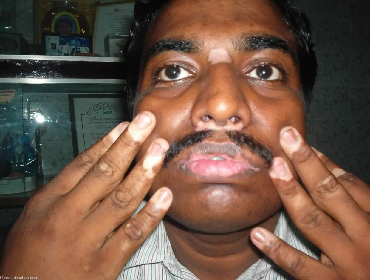 - Sites: Face (particularly around the orifices), neck, bony prominences of hands, legs, axillae and mucosal surfaces are particularly affected.