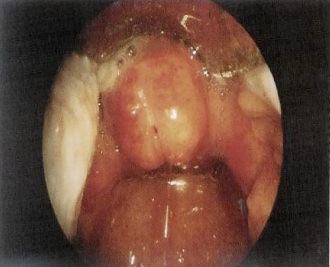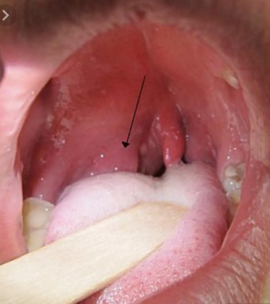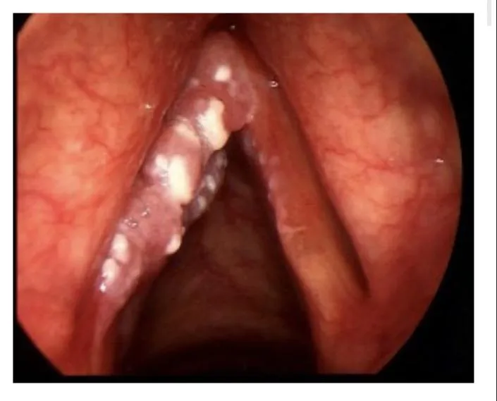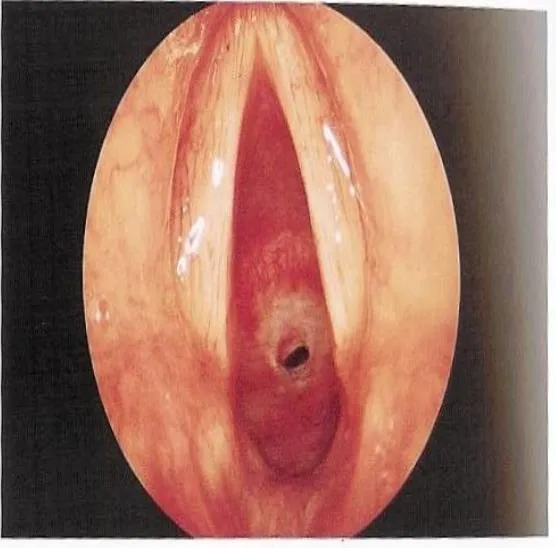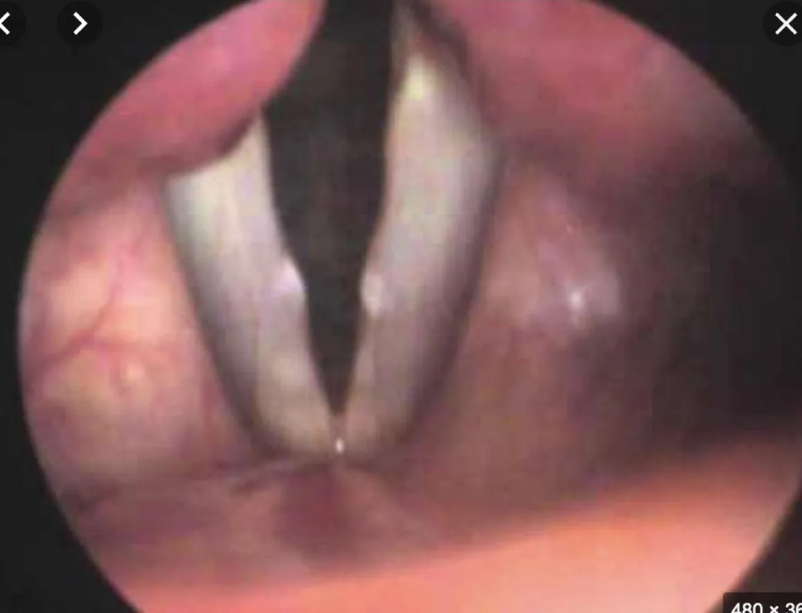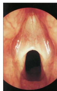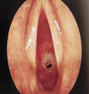 - Question: A 2 -month- old baby brought to the clinic by his parent with history of weak cry since birth and stridor, there was no chocking. on examination scope was performed and the finding is displayed in the picture.