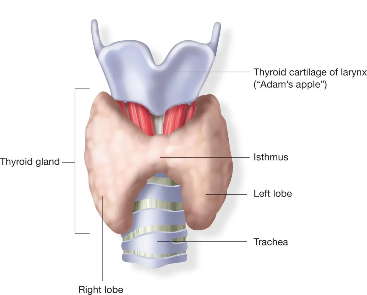 Positioned near the front of the neck, it lies against and around the front of the larynx and trachea.