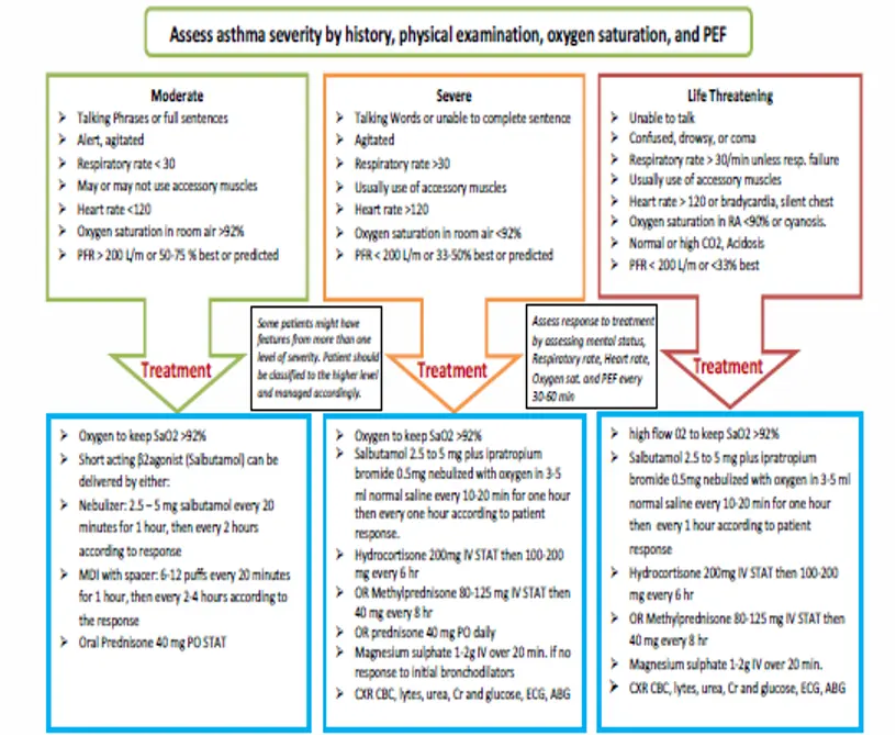 | FEV1 or peak flow | >80% of predicted/personal best | 60–80% of predicted/personal best | <60% of predicted/personal best |
