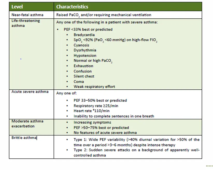 - Levels of Severity of Acute Asthma Exacerbations in Adults