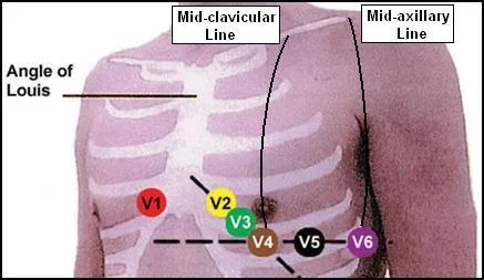 If you see changes in leads V1 - V4 that are consistent with a myocardial infarction, you can conclude that it is an anterior wall myocardial infarction.