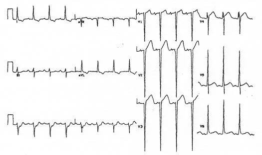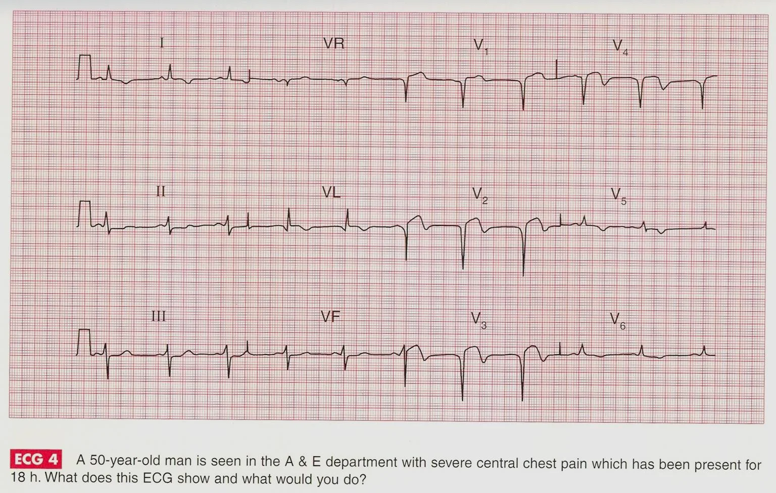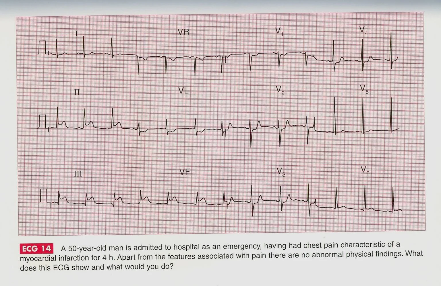 A 50-year-old man is admitted to hospital as an emergency, having had chest pain characteristic of a myocardial infarction for 4 h. Apart from the features associated with pain there are no abnormal physical findings. What does this ECG show?