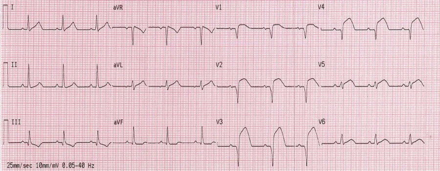 A 50-year-old man is seen in the A & E department with severe central chest pain which has been present for 18 h. What does this ECG show?