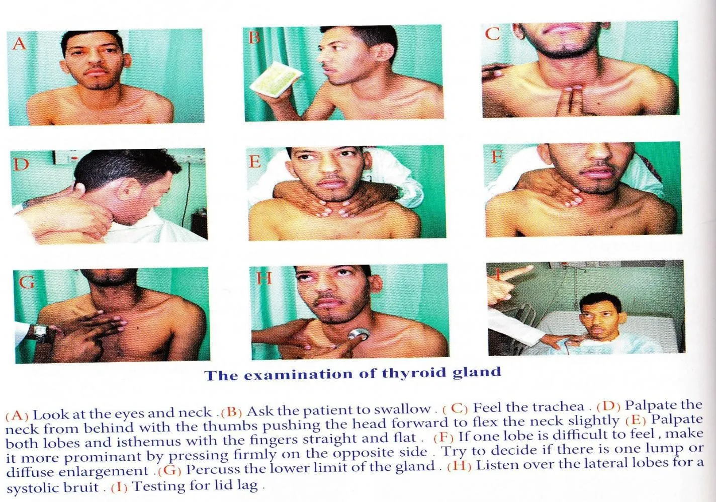 - (E) Palpate both lobes and isthmus with the fingers straight and flat.