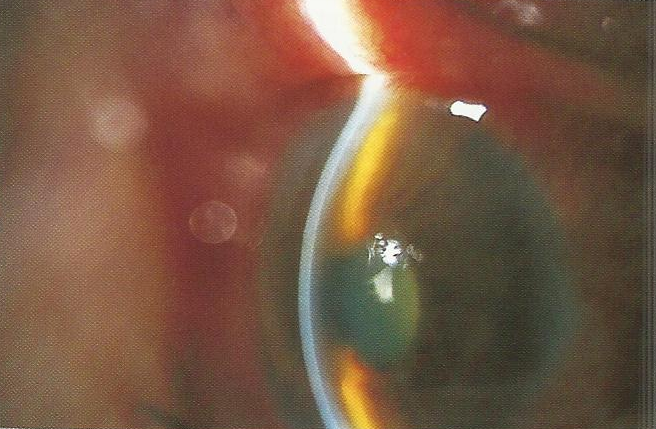 The lens was clear. The left eye was normal except for a shallow AC. The IOP was 46 mmHg OD and 14 mmHg OS. Fundus examination and gonioscopy OD were not possible because of the corneal haze. Examination of the OS revealed a normal CD ratio of 0.2, and gonioscopy OS revealed a narrow angle.