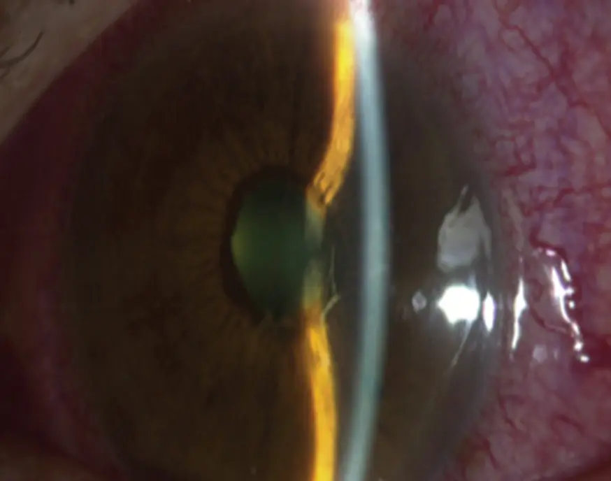 A 67-year-old farmer presented to the eye unit of a teaching hospital with a history of gradual, painless vision loss, and he was searching for his glasses change. History of headache, intermittent pain, redness. He is a cardiac patient and hypertensive 20 years ago. His presenting aided visual acuity was 6/60 in the right eye and 6/24 in the left eye. Both corneas were clear, and the pupils had a slow reaction to light. The right eye had a nuclear sclerotic cataract which precluded a good view of the optic nerve head, and a vertical cup :disc ratio (VCDR) of about 0.7, barely visible through the dilated pupil with the binocular indirect ophthalmoscope. The left eye VCDR was 0.5. Intraocular pressure (IOP) was 32 mmHg (right eye) and 27 mmHg (left eye) by applanation tonometry. Gonioscopy showed narrow angles in both eyes. Slit lamp examination shows atrophic iris patches. Patient was heavy smoker.
