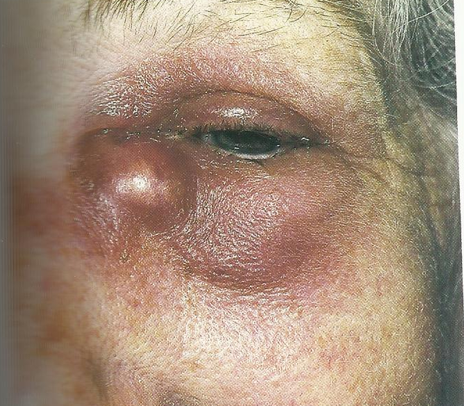 A 60-year-old woman complained of tearing and pain in her right eye. She had no history of trauma or surgery of the eyelids, nose or sinuses. She had tearing and discharge for several months. Recently she had developed a painful red lump near the right inner canthus. Examination showed her vision to be 6/6 OU. There was an erythematous swelling over the right lacrimal sac.