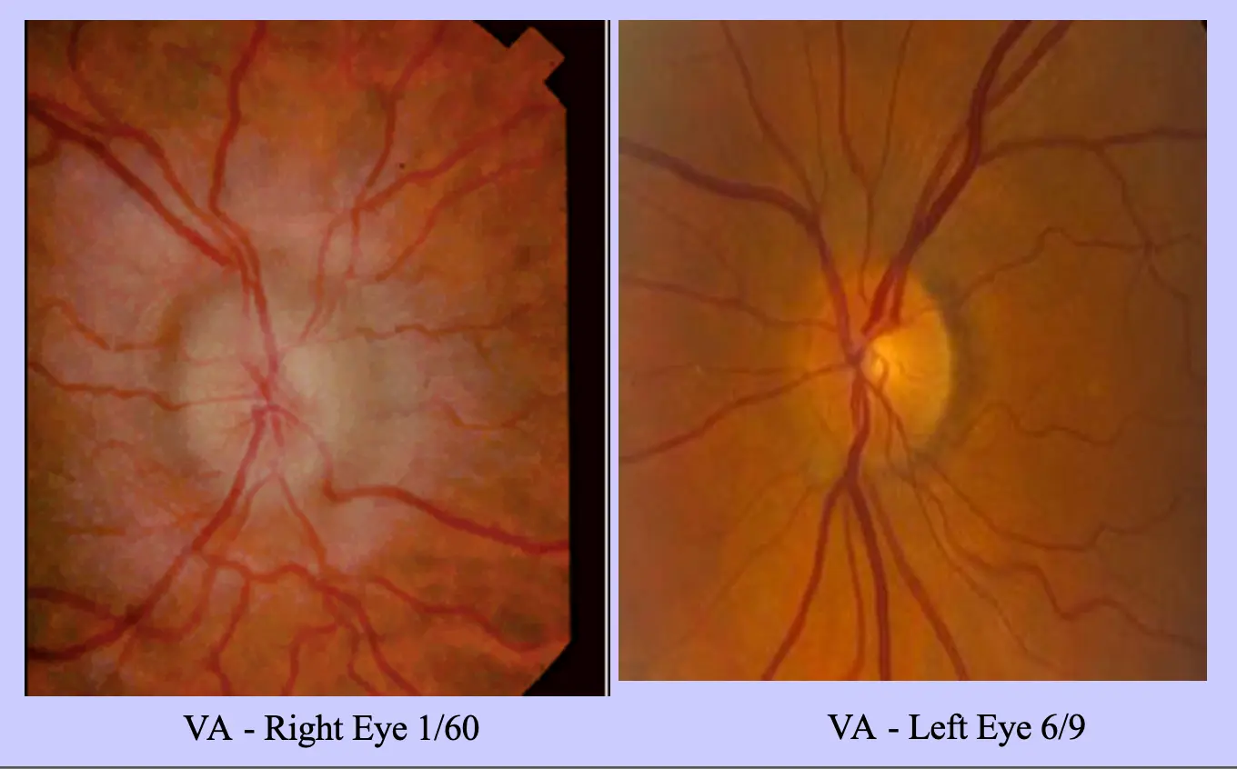- Vision: Right eye 1/60 (no improvement), Left eye 6/9.