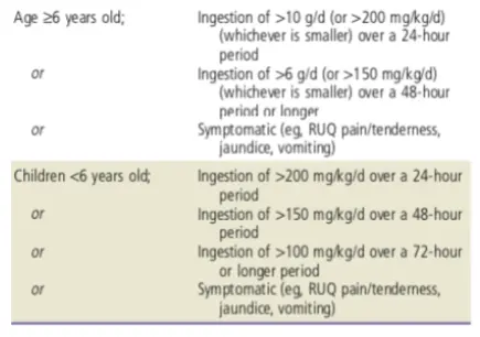 - Determination of the need for NAC is based on assessment of the risk for hepatotoxicity and measurement of serum levels of acetaminophen and AST.