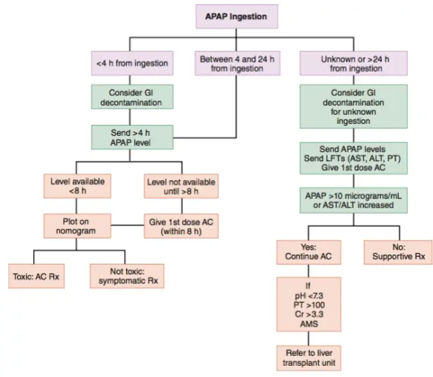 - Serum acetaminophen concentration 4 hours after ingestion or as soon as possible after 4 hours.