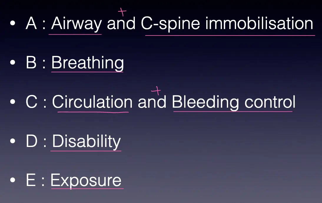 Goal: Ensure the patient is not in a life-threatening situation. If you find a pathology at any step, do not proceed to the next step unless you correct the pathology.