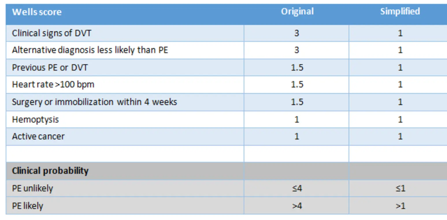 - Wells Criteria: Clinical signs of DVT (3), Alt diagnosis less likely (3), Heart rate > 100 (1.5), Immobilization (1.5), Previous VTE (1.5), Hemoptysis (1), Cancer (1).