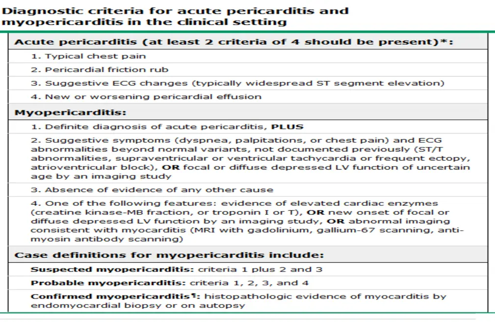 Diagnosis Criteria: Requires 2 of 4 (Typical pain, Friction rub, ECG changes, Effusion).