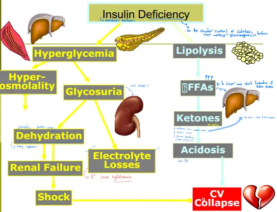- Insulin Deficiency: Anabolic hormone lost Catabolic hormones take over (Gluconeogenesis).