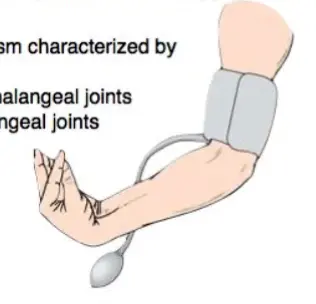 Trousseau’s sign: induction of carpopedal spasm by inflating cuff above SBP for 3 minutes → adduction of thumb, flexion of MCP joints, extension of IP joints, fl exion of wrist.