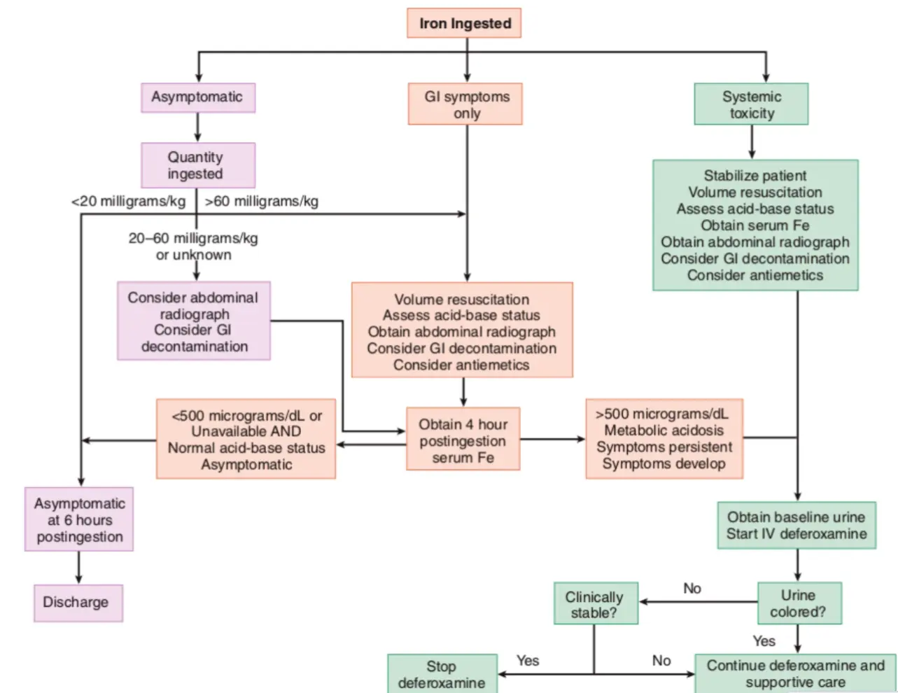 Discharge criteria: If peak iron remains < 300 μg/dL, is not rising, and the patient remains asymptomatic during 6 hours of observation, the patient can be discharged home.