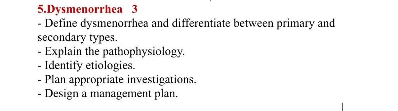 - Define dysmenorrhea and differentiate between primary and secondary types.