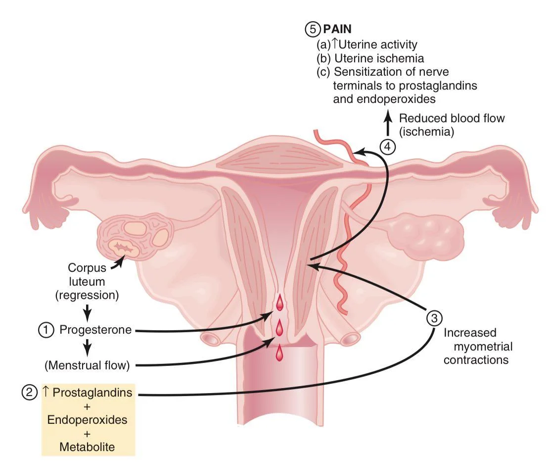 - Pain is primarily due to the release of prostaglandins during menstruation. Prostaglandins cause the uterus to contract, which can lead to reduced blood flow to the uterus, causing ischemia (lack of oxygen) and pain. The increased levels of prostaglandins contribute to uterine hypercontractility, which is often felt as cramping pain. This pain typically peaks at the beginning of the menstrual period and usually decreases as menstruation progresses.