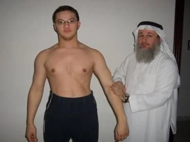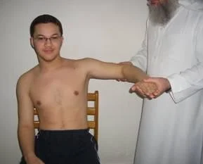- Standing with the R shoulder adducted and internally rotated and elbow extended.