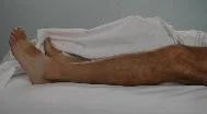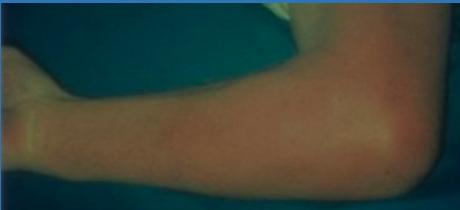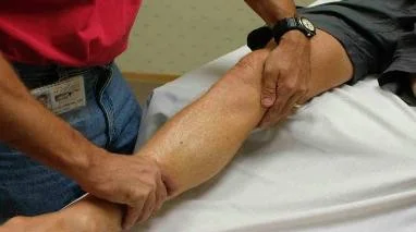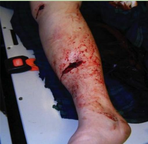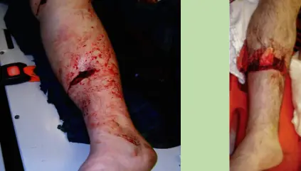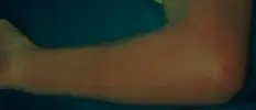 -tense, shiny leg swelling with blisters in compartment syndrome.