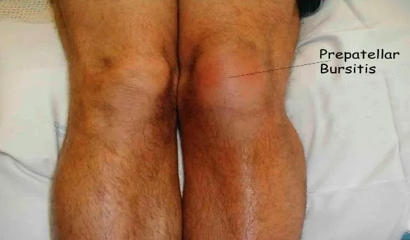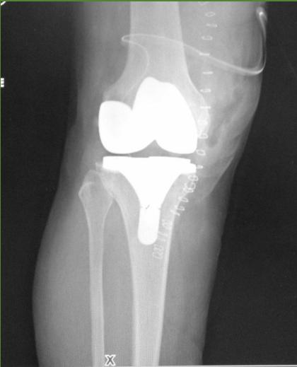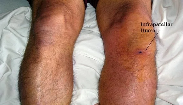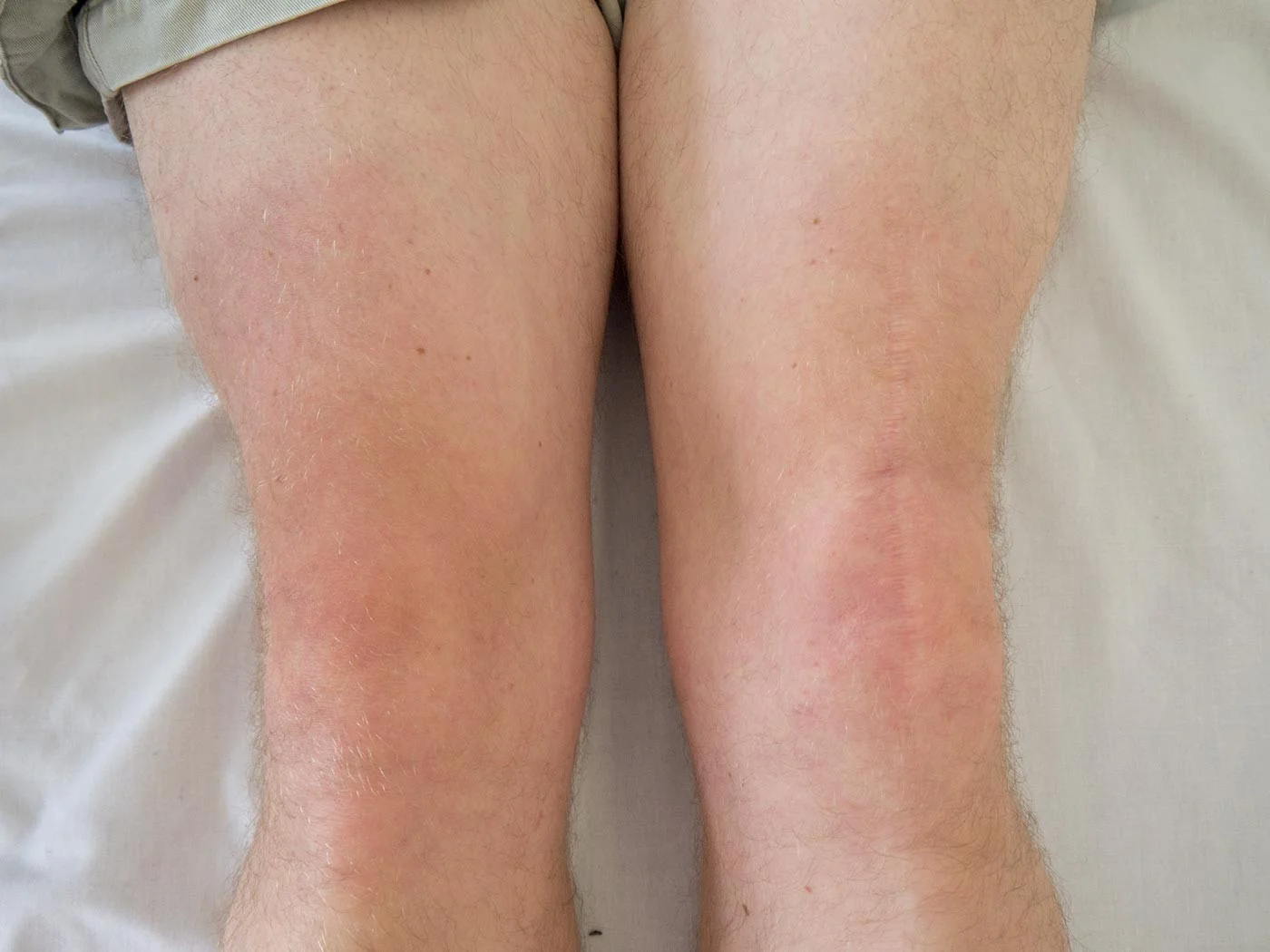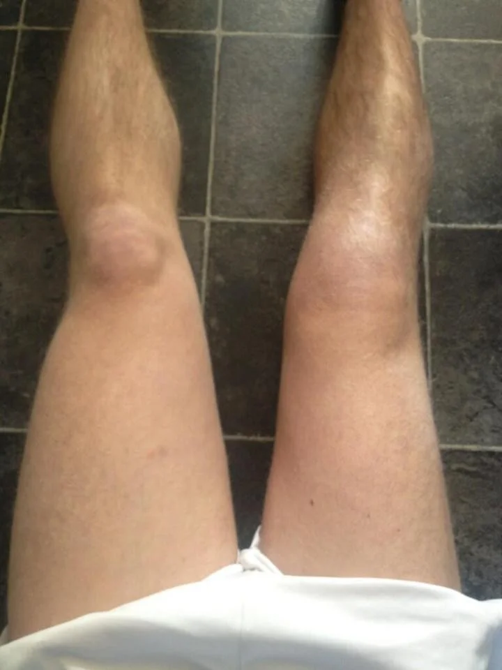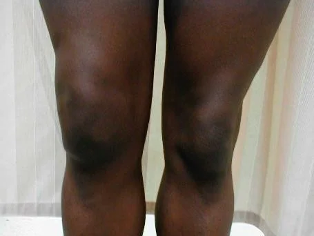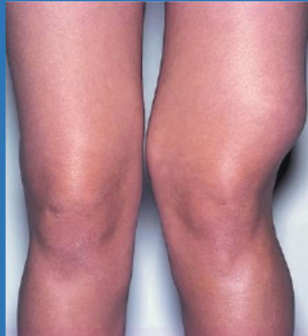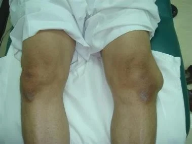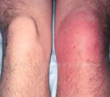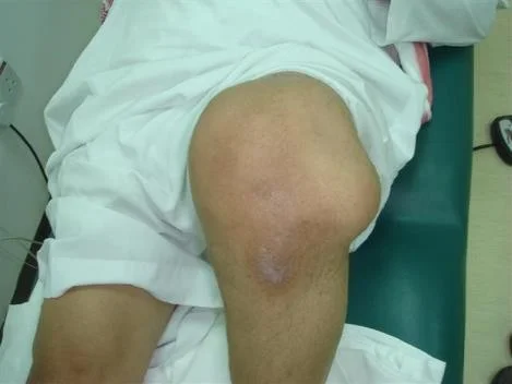 - Swollen and erythematous knee joint with visible effusion in septic arthritis.