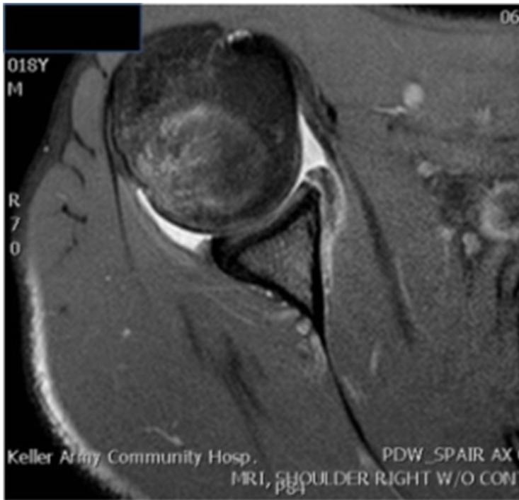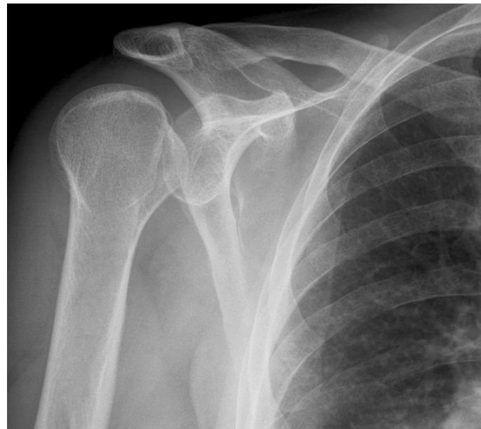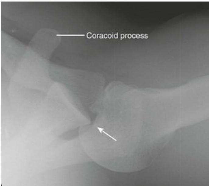 - Flattened shoulder contour with subcoracoid humeral head bulge in anterior dislocation.