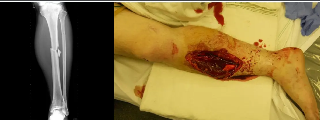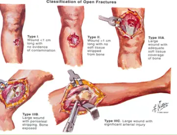 | Open Fracture | Skin break, exposed bone | ABC, cover wound, splint, antibiotics |