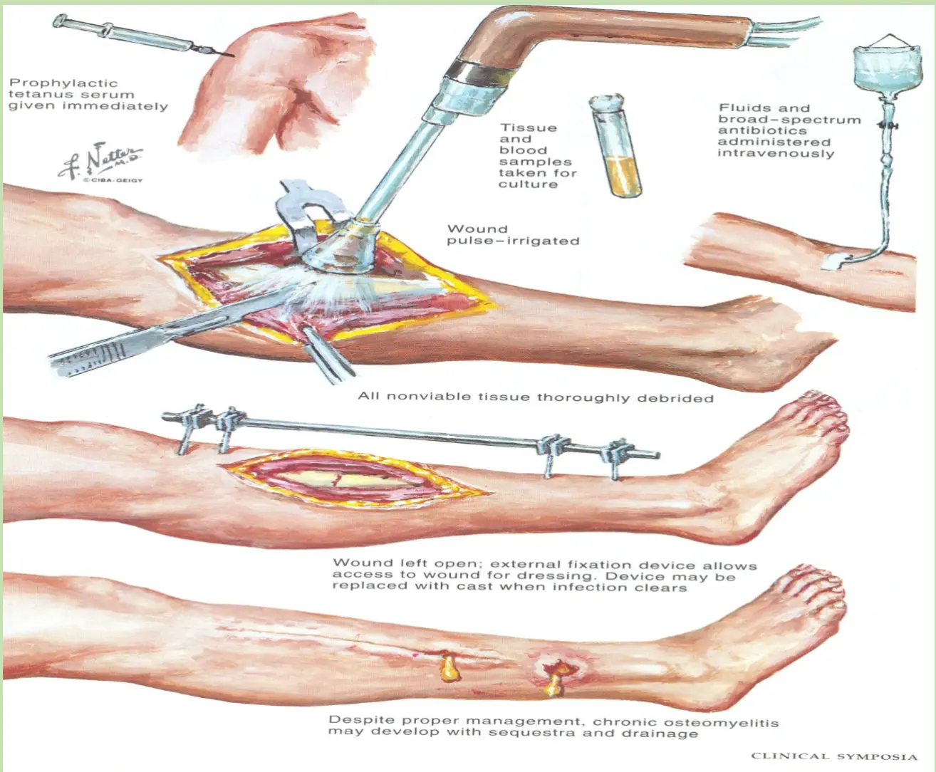 - Despite proper management, chronic osteomyelitis may develop with sequestra and drainage