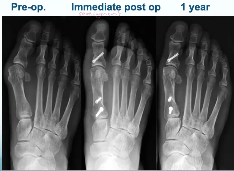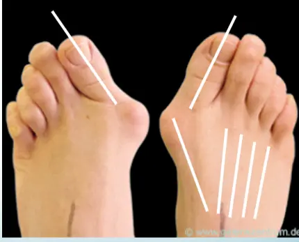 - Definition: lateral deviation of the great toe (hallux) and medial deviation of the first metatarsal