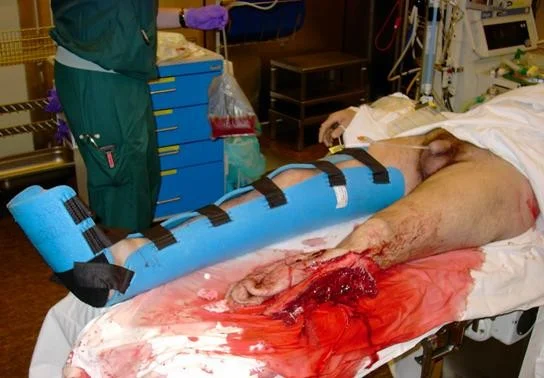 - Early pelvic splintage / sheet/ clamp. External fixator and