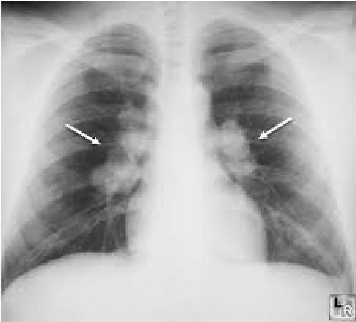 - Bilateral hilar lymphadenopathy, interstitial changes.