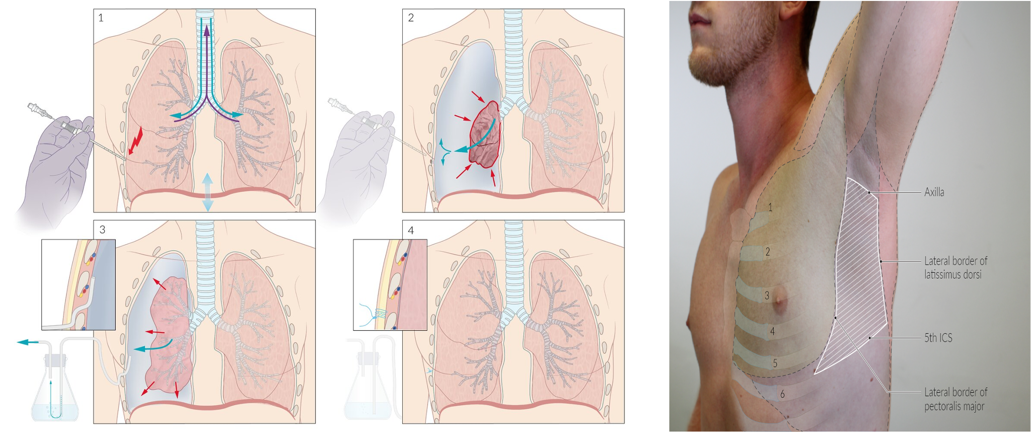 Management of Tension Pneumothorax: Causes collapse of the lung and shifting of the trachea and mediastinum to the opposite side.