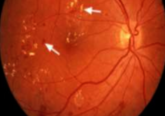 1. What fundus changes can you see here? Name any 2. Hard exudates and dots and blots hemorrhage