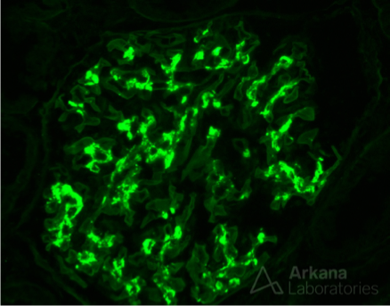Diagnosis: Renal biopsy showing mesangial deposits.
