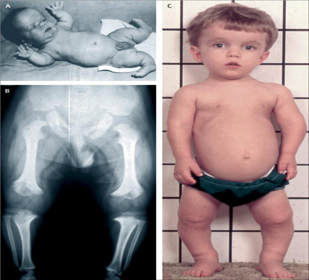 AchondroplasiaShort stature, marked shortening of limbs, large head, frontal bossing, depression of nasal bridgeHydrocephalus, marked lumbar lordosisMutation in FGFR3 gene on chromosome 4, autosomal dominant, 50% new mutationsNone specifiedGrowth hormone, limb lengthening