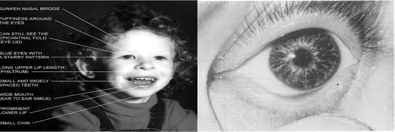 single palmar scar, kleniodactyl, sandal sign, flat occipital, hypothyroidism, constipitation, fatigue, liablity for leukemia