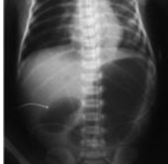 - The abdominal X-ray shows a hyper-lucent shadow separating the liver - (1 from the abdominal wall. This represents free air in the abdomen .which results from intestinal perforation (pneumoperitoneum)