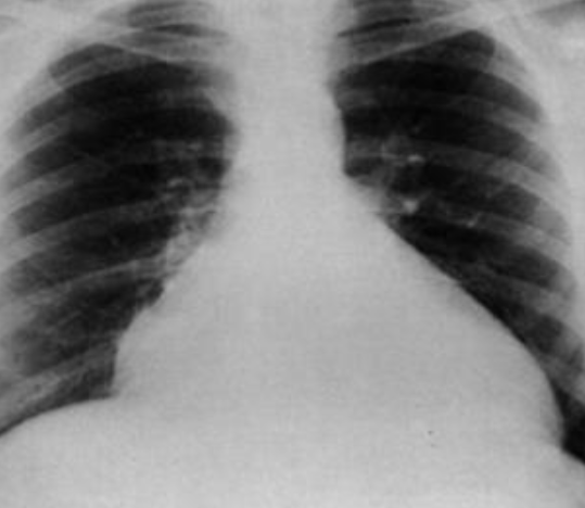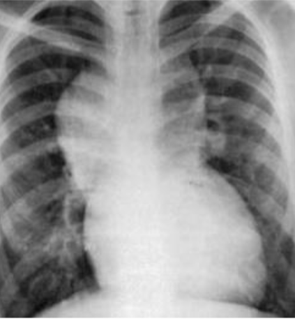 - Description: marked cardiomegaly extends from wall to wall (Box Shape)