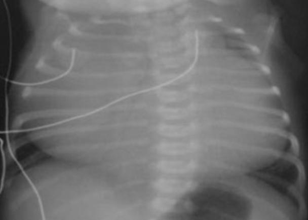 - AP chest film showing that the naso-gastric tube (NGT) is inside the left - (1 hemi-thorax. There is an ill-defined line separating the upper and middle .zones of left lung