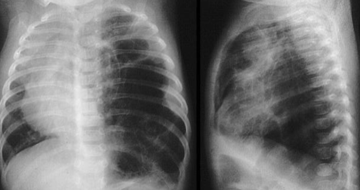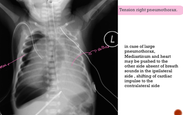 - The physical examination of the chest will not show the typical signs seen in ,adult, however, limitation of movement and plugging of the right hemithorax displaced heart sounds more laterally and absent air entry over the right side .can be found