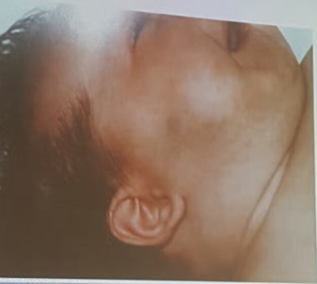 Central cyanosis, baby crying, bloody face, blue due to TGA. Z